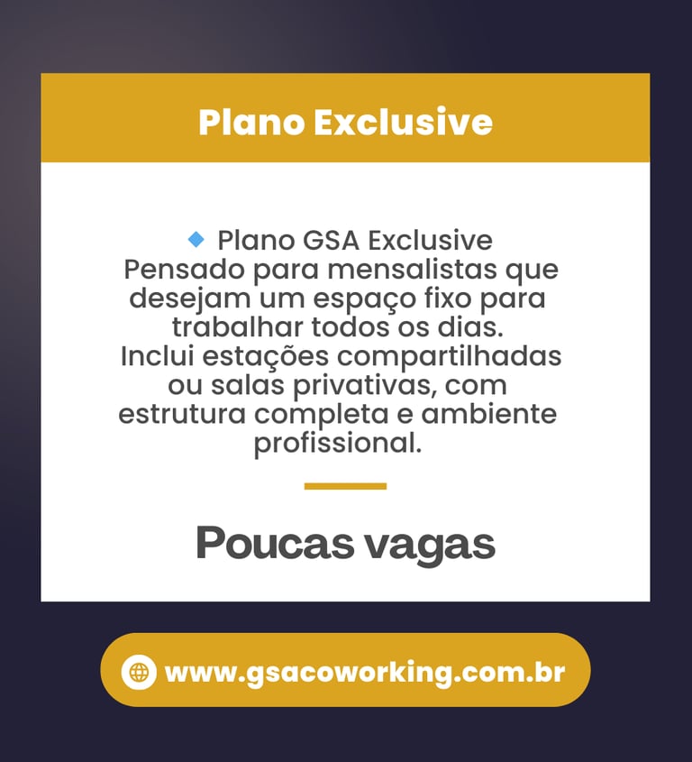 O espaço ideal para transformar sua rotina de trabalho em uma experiência produtiva e profissional. A GSA oferece uma estrutura completa com: